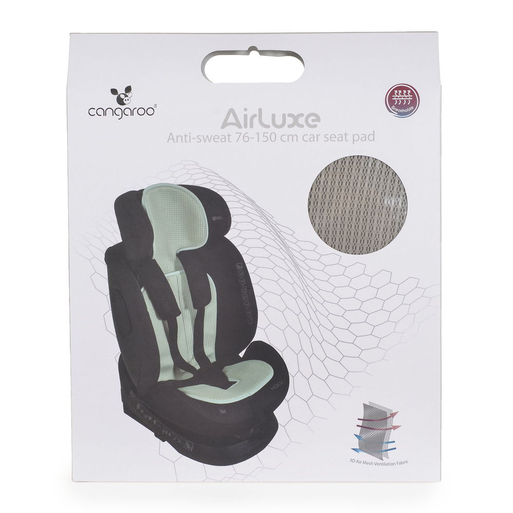 Az AIRLUXE betétet a maximális kényelem szem előtt tartásával tervezték utazás közben, csökkentve az izzadást és biztosítva az optimális légáramlást. Speciális 3D-s anyagból készült, 100% poliészterből, 1,3 cm vastag, 90% levegőt tartalmaz, a betét javítja a légáramlást a gyermek és az autósülés között, így kényelmet és frissességet biztosít az utazás során. A betét két különálló részből áll, amelyek egy 32 cm-es tépőzáras pánttal rögzíthetők, így a gyermek magasságához igazítható. Az anyag puha és kellemes tapintású.