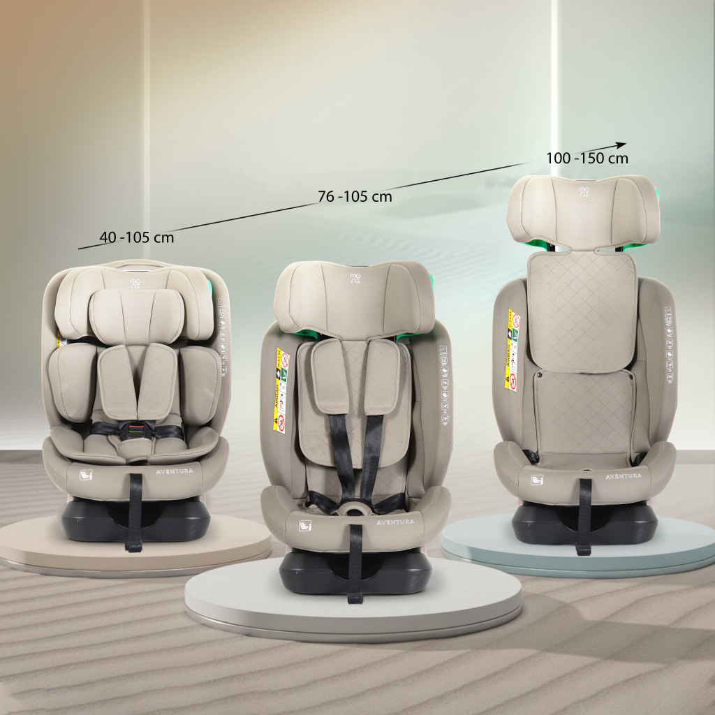 Moni Aventura autósülés úgy lett kialakítva, hogy minden utazás során magas szintű biztonságot, kényelmet és alkalmazkodóképességet biztosítson. Az R129/i-Size szabvány szerint jóváhagyott termék 40–150 cm magas gyermekek számára alkalmas, és a gyermek életkorának és fejlettségének megfelelően rugalmasan felszerelhető.