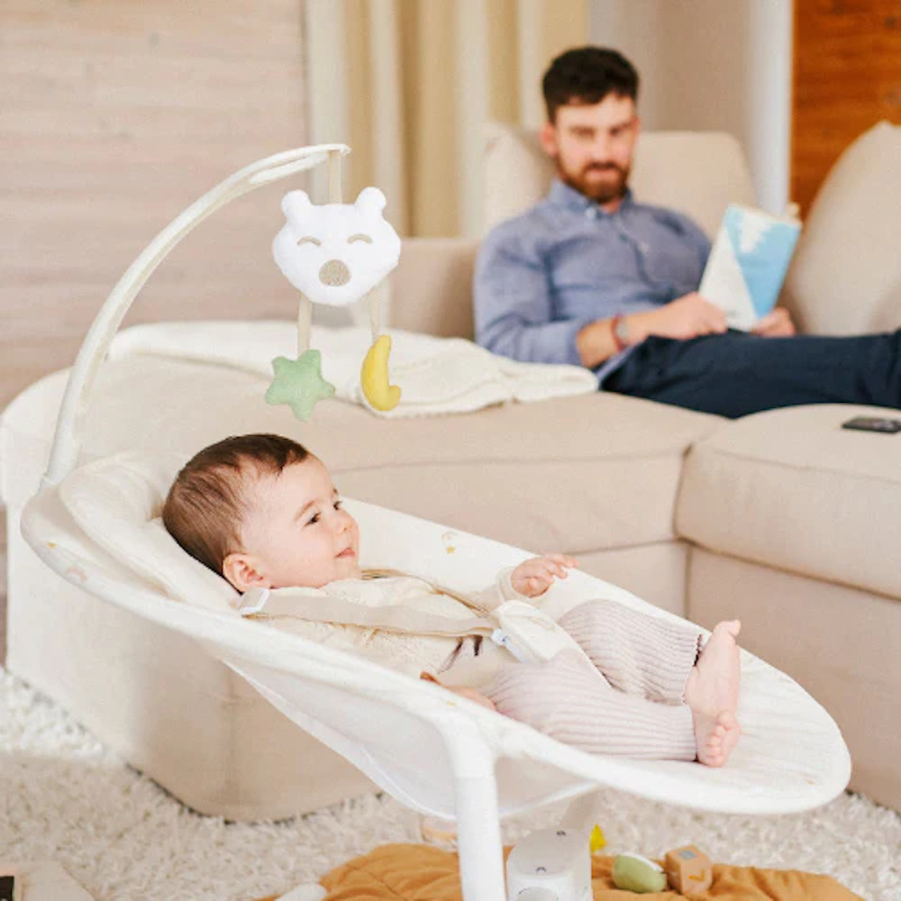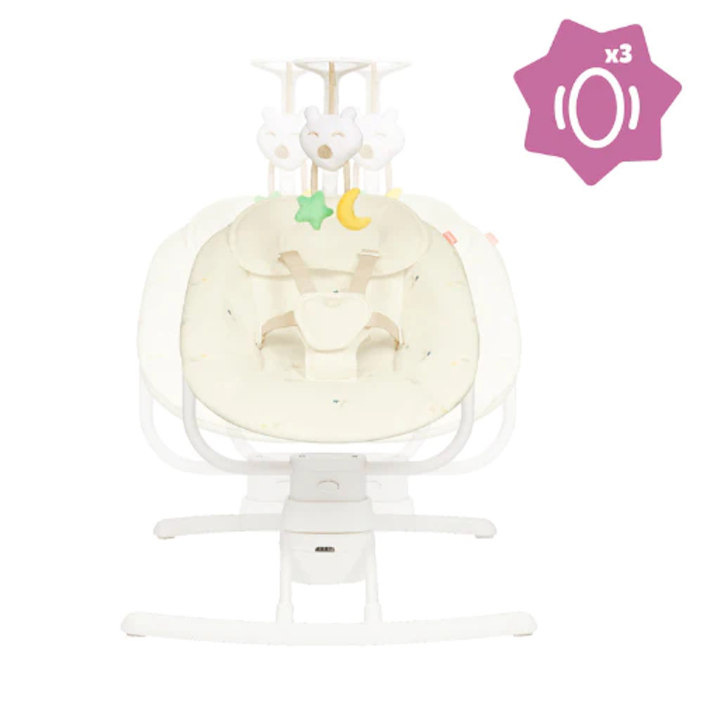 Akár megnyugtatja, ringatja vagy játszik babájával, a hinta 3 oldalirányú lengési sebességet kínál. Több pozícióba állítható játékív, amely elõsegíti a baba felébresztését. 5 pontos biztonsági övvel felszerelt, a baba így teljes biztonságban tud játszani.