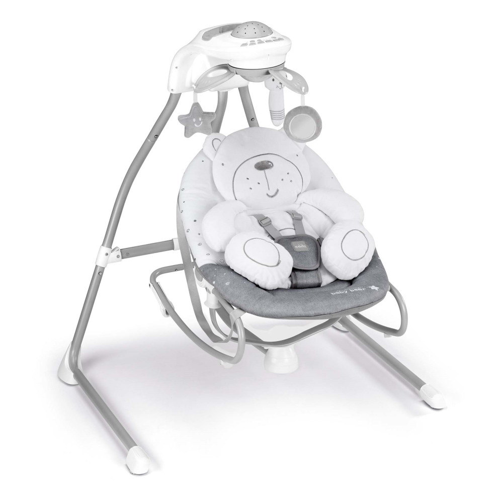 Az elektromos hinta kagylója körülöleli, ringatja, és megnyugtatja a babát. 4 sebességes hinta felfelé vetítõ projektorral. 5 dallam és 3 természetes hangot játszik, de akár MP3 lejátszót is rá lehet kötni. A hangereje állítható. Automatikus kikapcsolás-idõzítõvel rendelkezik (10-20-30 perc).