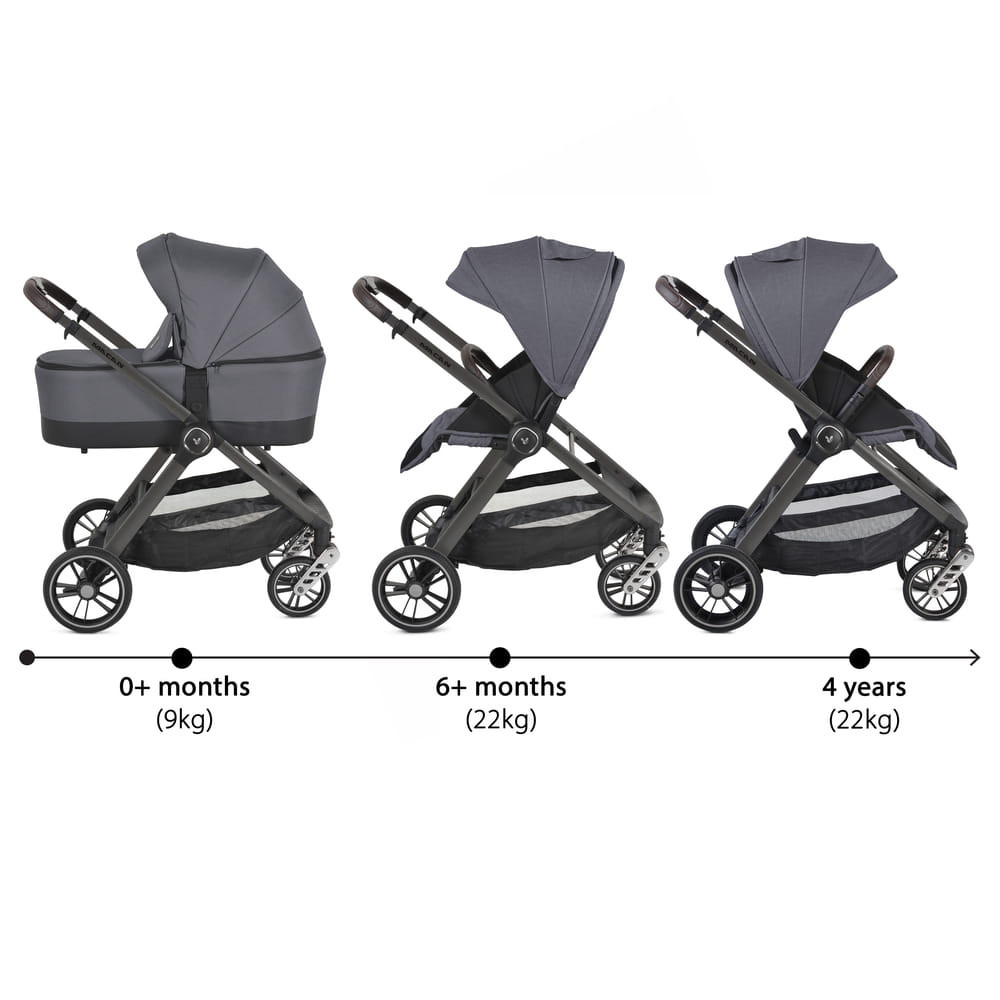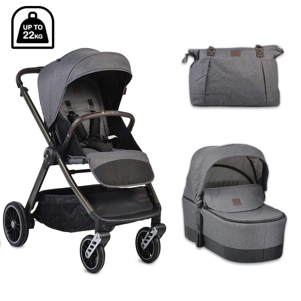 Kiváló minőségű babakocsi városra és vidékre, 22 kg-ig terhelhető. A készlet tartalma: mózeskosár, nyári ülés, lábhuzat és mamatáska. A PU kerekek, az első kerekek speciális lengéscsillapító rendszerrel vannak felszerelve minden terephez. Kézi varrás PU bőr fogantyú és lökhárító rúd. Ötpontos biztonsági öv. Állítható ernyő és lökhárító rúd. Széles poggyászkosár 3 kg-ig
