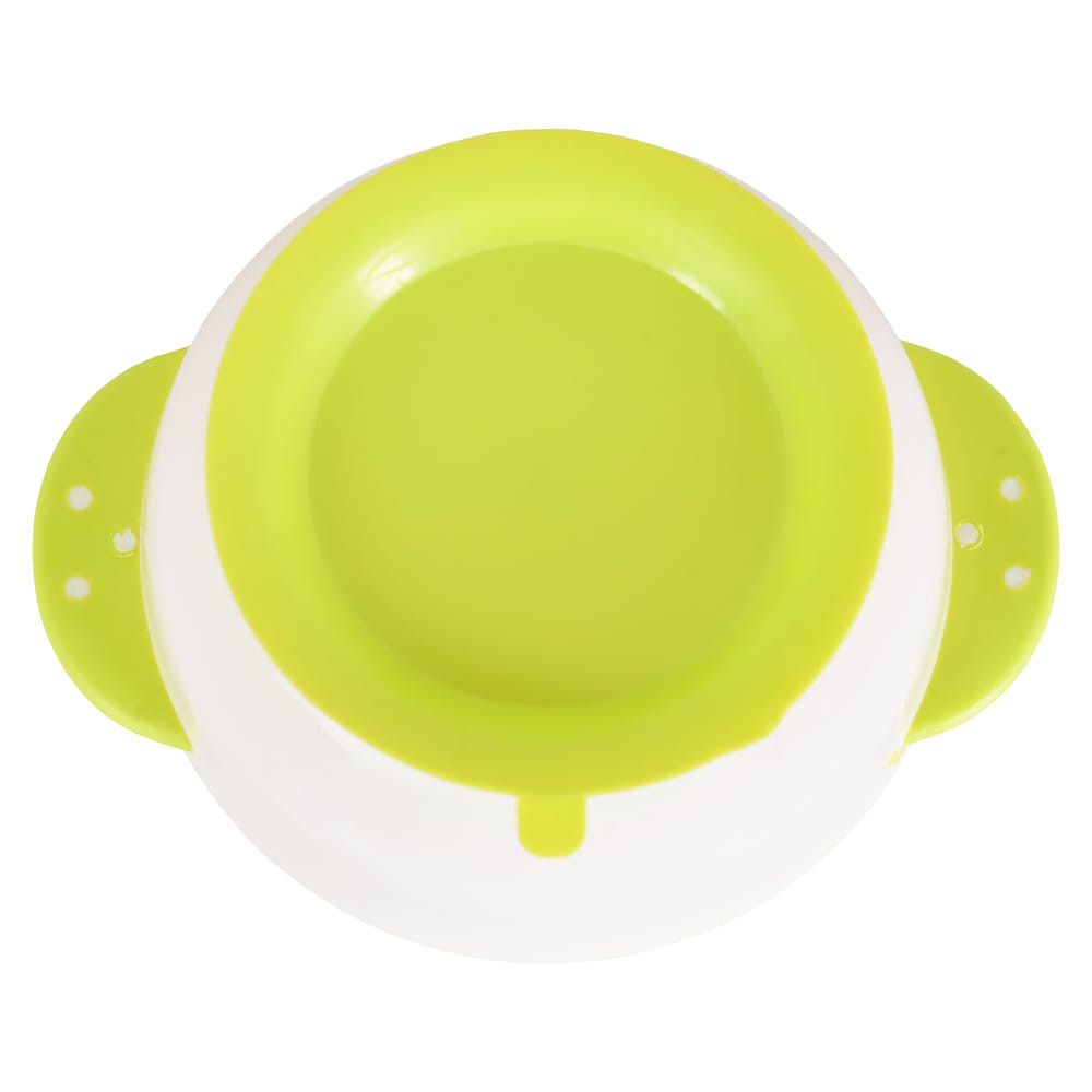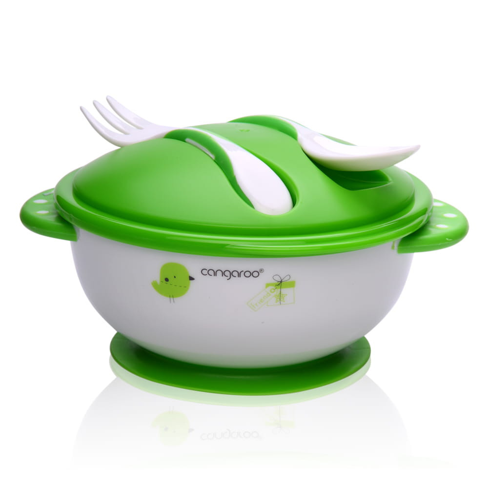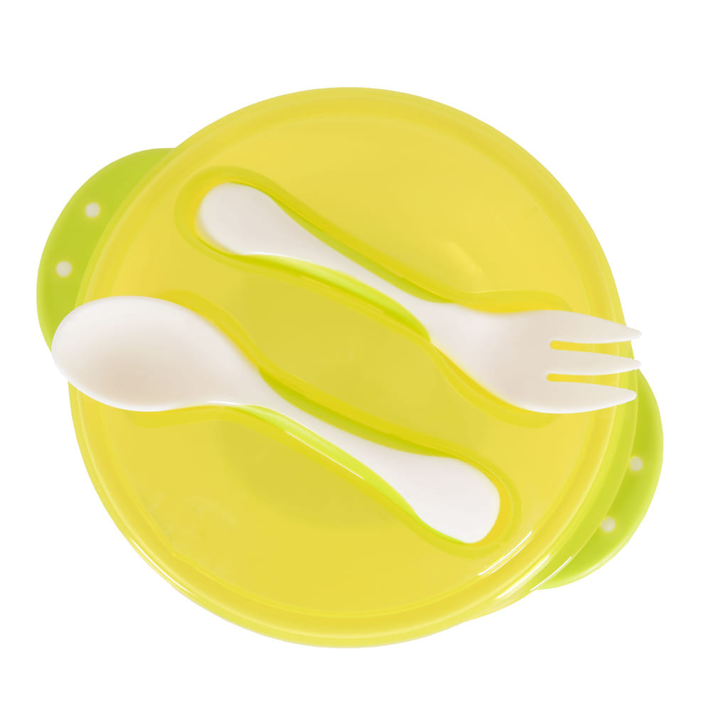 A termék 6 hónapos és idősebb gyermekeknek szól. Az edény, villa és kanál könnyű átmenetet biztosítanak a tej-alapú étrendről a szilárd ételek étrendjére. A termék gumialappal van felszerelve, hogy stabilan álljon az edény a felületen, és megakadályozza a kiömlést. Tartalom: PP, TPE, BPA-mentes.