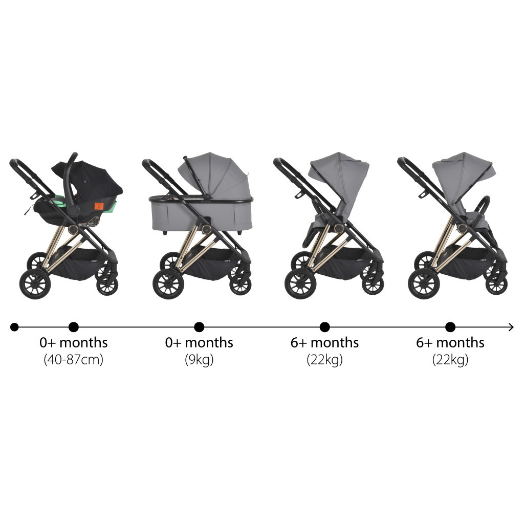A szett tartalmaz egy vázat, mózeskosarat, megfordítható ülést, i-SIZE autósülést (40–87 cm) és praktikus kiegészítőket, amelyek megkönnyítik a mindennapi sétákat és utazásokat.