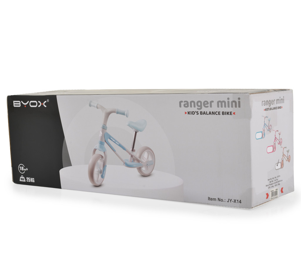 A futóbicikli vázát könnyű, magas carbon tartalmú acélból készítették. 18 hónaposnál idősebb gyermekek számára alkalmas, maximális terhelhetősége 25 kg. Csúszásmentes markolatok, 8 hüvelykes habkerék, lábtartó, 28 cm-től 36 cm-ig állítható puha nyereg. Byox Ranger Mini egy kompakt futóbicikli, amelyet kifejezetten a legkisebbek számára fejlesztettek ki, hogy már kisgyermekkorban is elősegítse az egyensúly, a koordináció és a motorikus képességek fejlődését. Könnyű és stabil kialakítása ideálisvá teszi az első önálló sétákhoz.