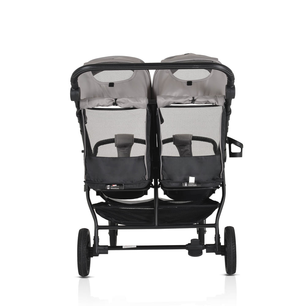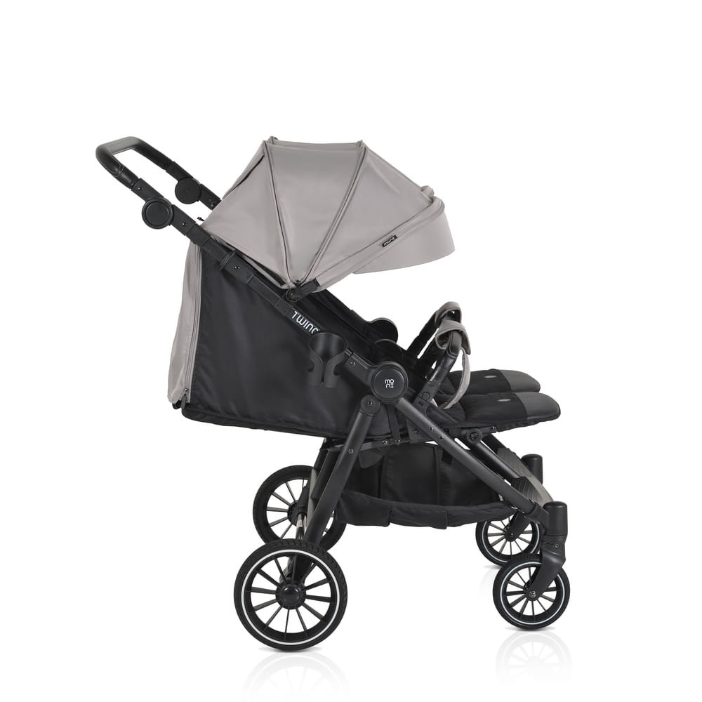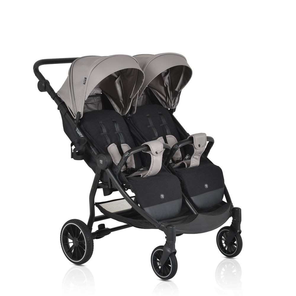 Az iker babakocsi születéstől körülbelül 36 hónapos korig alkalmas, legfeljebb 15 kg súlyú gyermekek számára. Három pozícióban dönthető háttámlával rendelkezik, beleértve a teljesen sík helyzetet, és egy hálós részt a jobb szellőzés érdekében. A kupola állítható, napellenzővel és hálós ablakkal a megfigyeléshez. A fogantyú állítható, öt pozícióban, varrott PU bőrből készült. Az 5 pontos biztonsági öv puha párnázással gondoskodik a biztonságról. A babakocsi első PU kerekekkel van felszerelve, amelyek 360 fokban forognak, reteszelő mechanizmussal és lengéscsillapítókkal minden keréken. A kerekek egy gombnyomással egyszerűen eltávolíthatók. Kompakt és könnyen összecsukható. Levehető PU bőr lökhárító rúd és három pozícióban állítható lábtámasz. A háttámlán tárolózseb áll rendelkezésre a tartozékok számára. A készlet praktikus cipzáras lábvédőt és pohártartót tartalmaz.