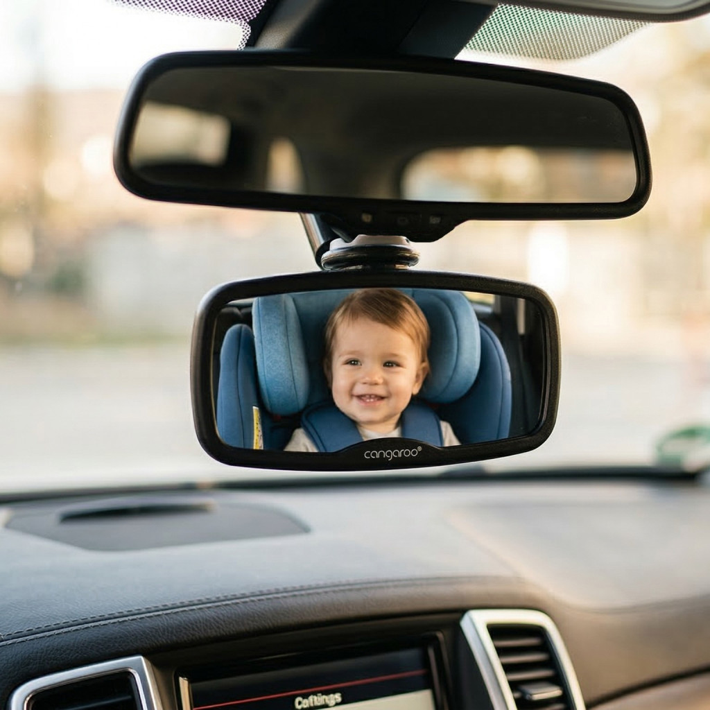 Praktikus Cangaroo Visio autós tükör , amely lehetővé teszi a szülők számára, hogy utazás közben megfigyelhessék gyermeküket , amint az autósülésben ül a hátsó ülésen.