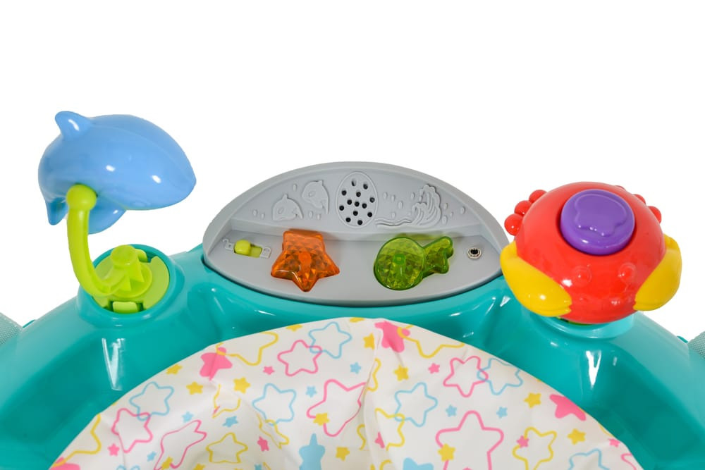A beépített interaktív játékok különböző élénk színekben és formákban, valamint a fényekkel és két hangerősséggel ellátott zenélő tábla fejlesztik a